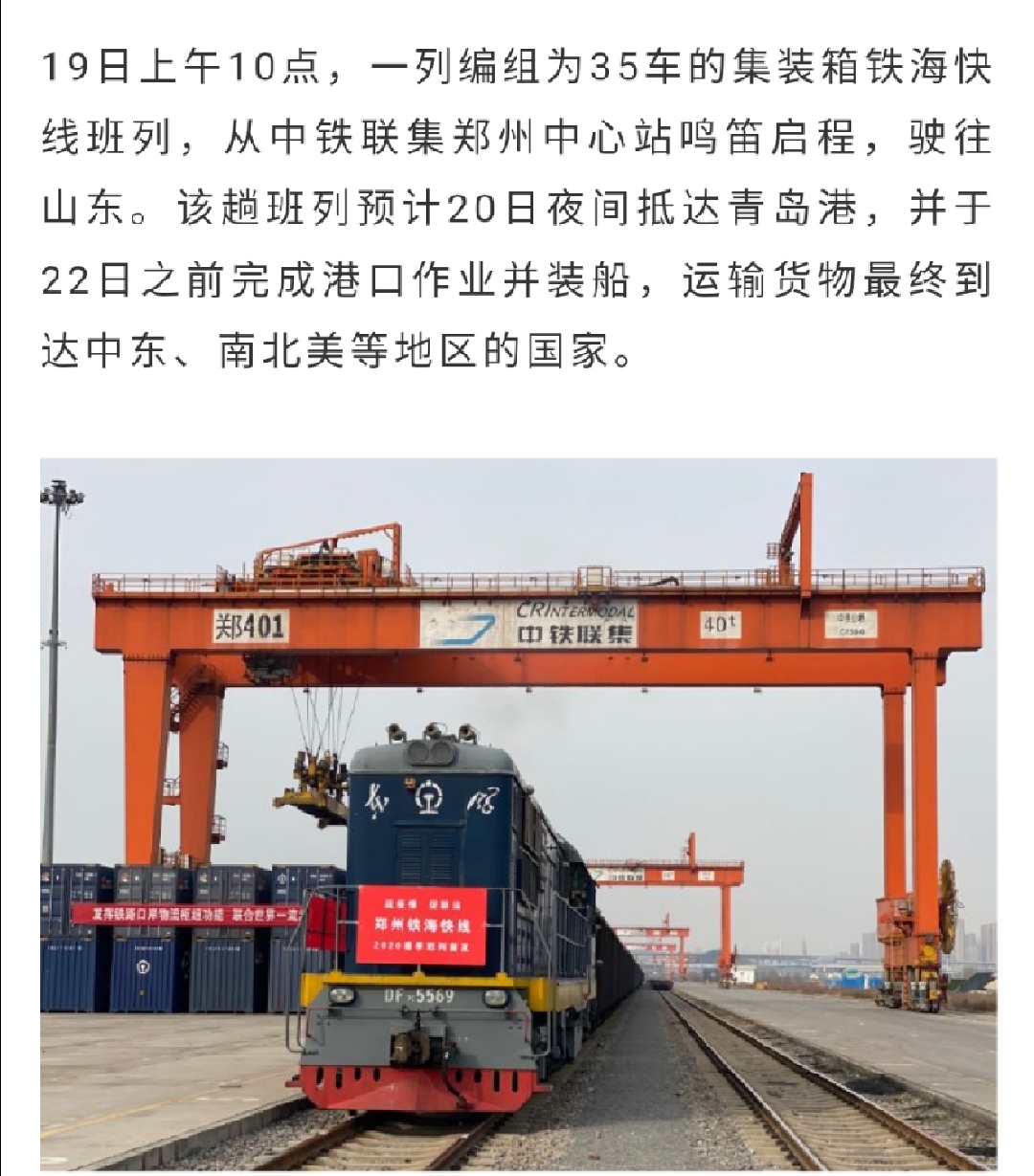 Этот поезд полон груза. Он начинается от Чжэнчжоу до стран Ближнего Востока, Северной и Южной Америки и других регионов.